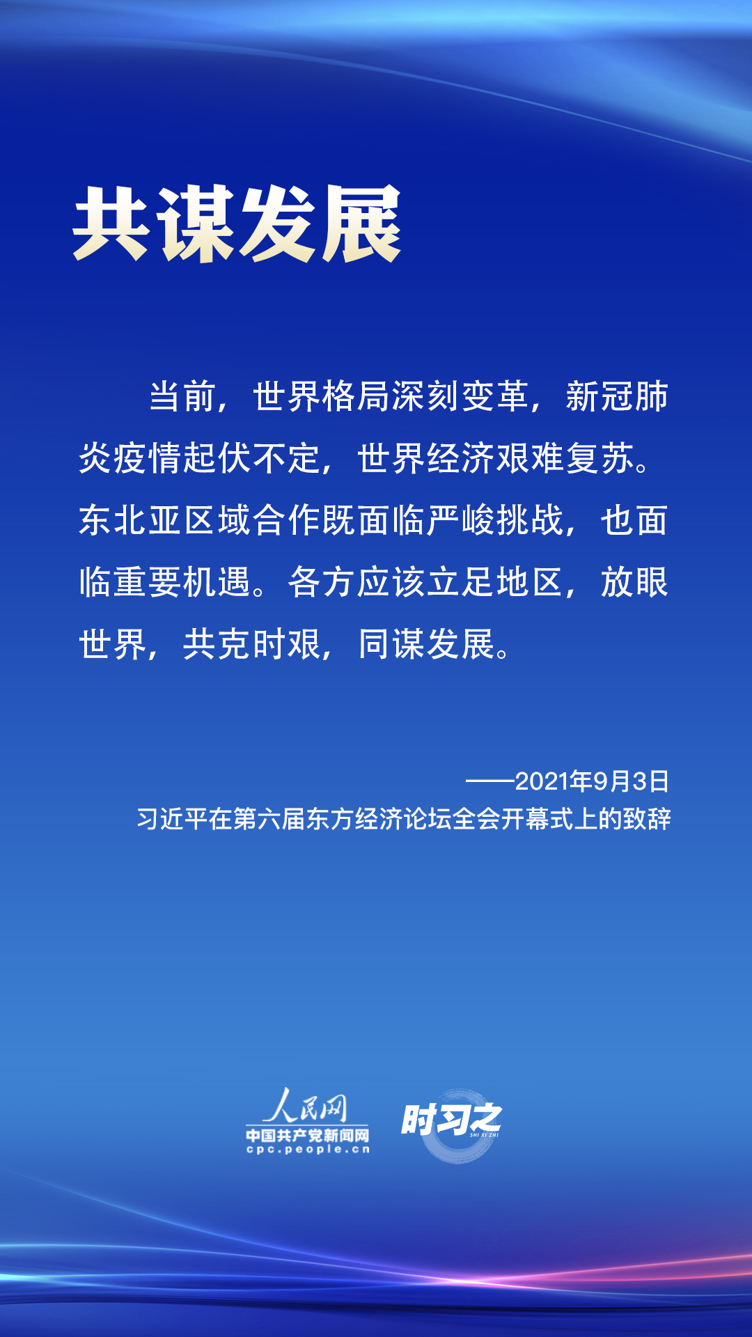 国家主席习近平9月3日应邀以视频方式出席第六届东方经济论坛全会开幕式并发表题为《共克时艰,同谋发展 携手谱写远东合作新篇章》致辞。这是习近平时隔3年再次出席东方经济论坛。2018年9月2日,习近平在第四届东方经济论坛全会发表了题为《共享远东发展新机遇 开创东北亚美好新未来》的致辞。在这两次致辞中,合作、和平、发展是不变的主题。