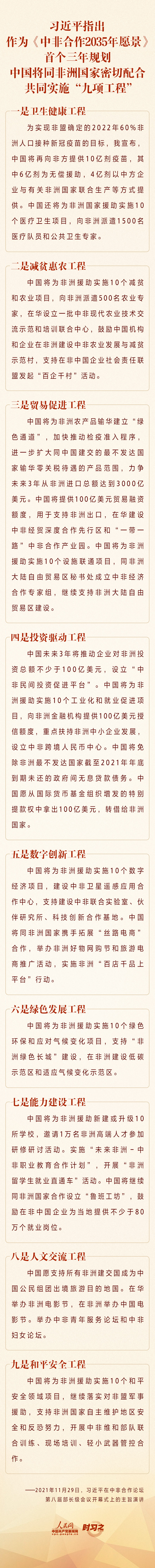 11月29日晚,国家主席习近平在北京以视频方式出席中非合作论坛第八届部长级会议开幕式并发表主旨演讲。习近平就构建新时代中非命运共同体提出4点主张,并指出,作为《中非合作2035年愿景》首个三年规划,中国将同非洲国家密切配合,共同实施“九项工程”。