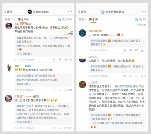 其实我们公司还有很多工程机械设备,客户口碑、反馈也都很好,尤其是我们刚研发的新品——压路机,造型也是霸气十足,被业内称为“最酷压路机”。这次是移动照明车,如果以后有需要、其它机械设备也任剧组挑选……”