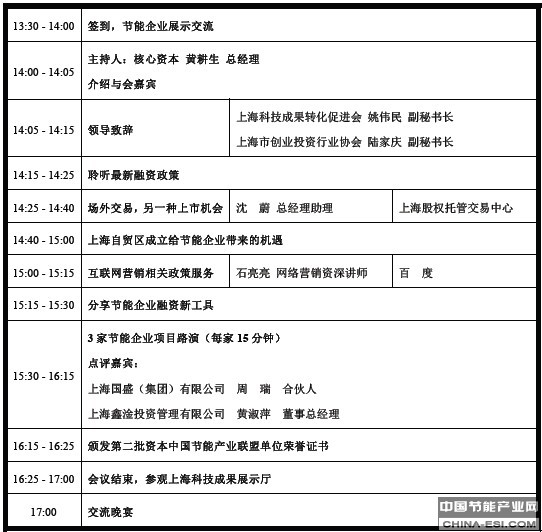本次峰会以“壮大节能产业发展,助力节能企业腾飞”为主题,从聆听政府政策--上海自贸区成立给节能企业带来的机遇--分享节能企业融资工具---场外交易市场上市解剖---互联网营销相关政策等,为节能企业提供一站式服务。活动以峰会加展示的形式,设置10个展位,仅供节能企业、金融服务机构进行产品展示。