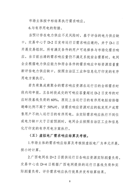 其中负荷集成商聚合的单个虚拟电厂最小响应能力不低于1兆瓦,单个需求响应资源最小响应能力不低于0.2兆瓦,响应时长均不低于1小时。需求响应资源须安装分时计量表计,且将计量数据传送至广西电网。计量表计的最小计量周期为15分钟。