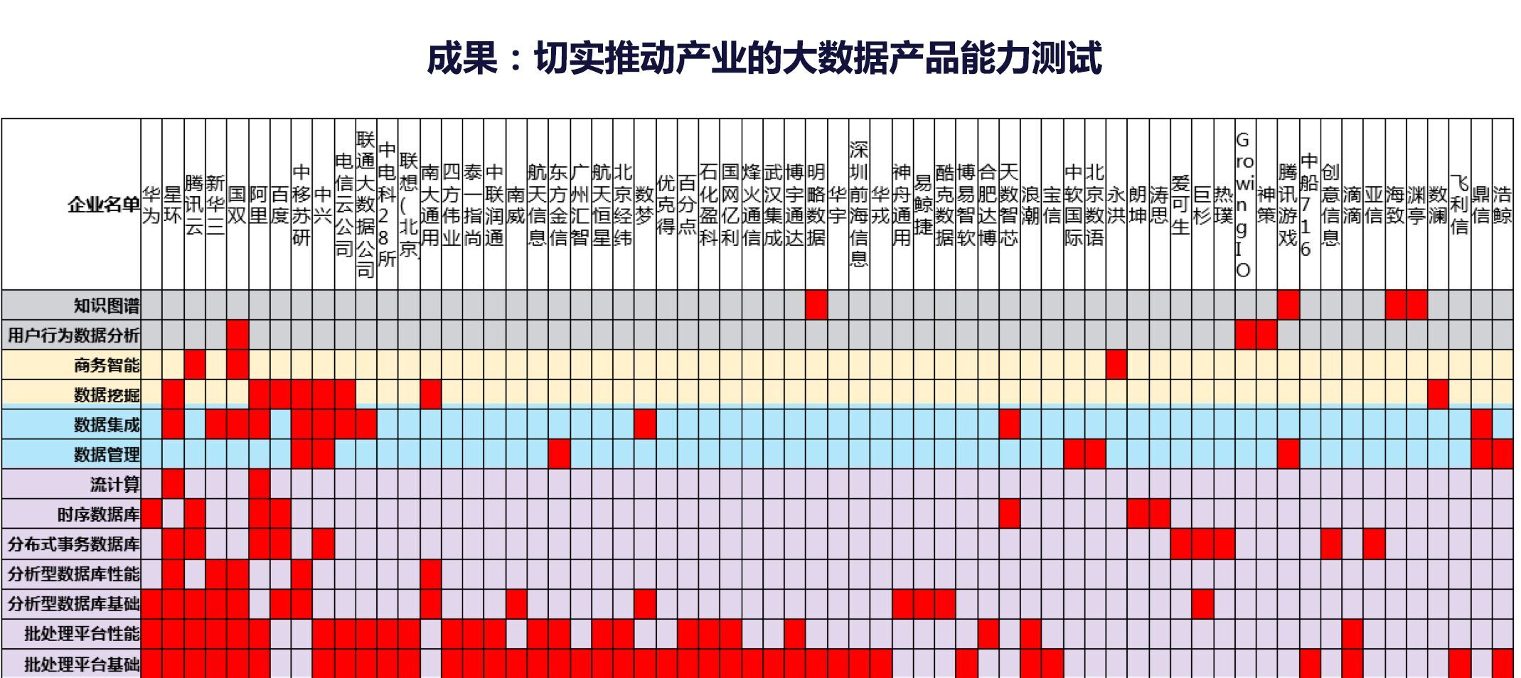 大数据产品能力评测。从上图可以看到,横向是国内做这些产品的企业大概是什么规模,如有华为、阿里、腾讯、百度。纵坐标看产品体系的丰富度。如知识图谱、用户行为分析、商务智能等,纵坐标越长,代表国内产品体系越繁荣,红色点是代表这个企业在这个基础方向上完成的测试,企业的红点越多,代表这个企业的综合产品能力越强,也就是产品体系越丰富。
