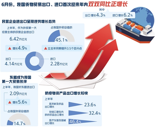 据海关统计,6月份我国货物贸易进出口同比增长5.1%,其中出口增长4.3%,进口增长6.2%;今年上半年,我国货物贸易进出口总值14.24万亿元人民币,同比下降3.2%,降幅较前5个月收窄1.7个百分点。