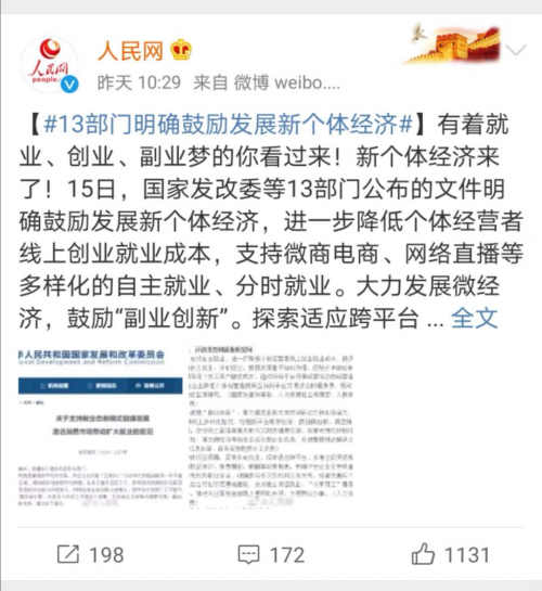 从整体的内容上来说,其实该《意见》的出台,更重要的一点是明确鼓励发展新个体经济,进一步降低个体经营者线上创业就业成本,支持微商电商、网络直播等多样化的自主就业、分时就业。大力发展微经济,鼓励“副业创新”。探索适应跨平台、多雇主间灵活就业的权益保障、社会保障等政策。