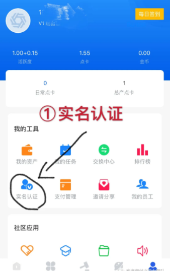 2、众赢兼职实名认证。点击“我的”-“实名认证”,认证后会赠送一个任务,每天产0.5个币(众赢兼职里叫点卡),总共30天产15个点卡。