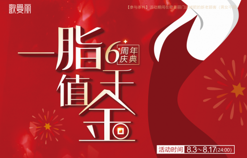 时间过得飞快,随着今年的第一片落叶飘下,歌曼丽也即将迎来属于它的六周岁生庆。2020年的奇幻开局,也让这一次的庆典多了许多值得感恩的故事,为了回馈那些努力、拼搏、感动,迎接新的阶段新的开始,歌曼丽将于8月3日—8月17日(24:00)举办“一「脂」值千金”活动,三重好礼,狂撒千万福利敬谢新老顾客不离久伴。