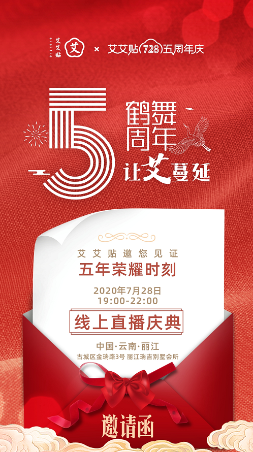 本次艾艾贴5周年庆,以“鹤舞周年,让艾蔓延”为主题。本主题寓意祝贺艾艾贴5周年庆的顺利举办,也预祝着艾艾贴事业红红火火、越来越好的美好祝福。