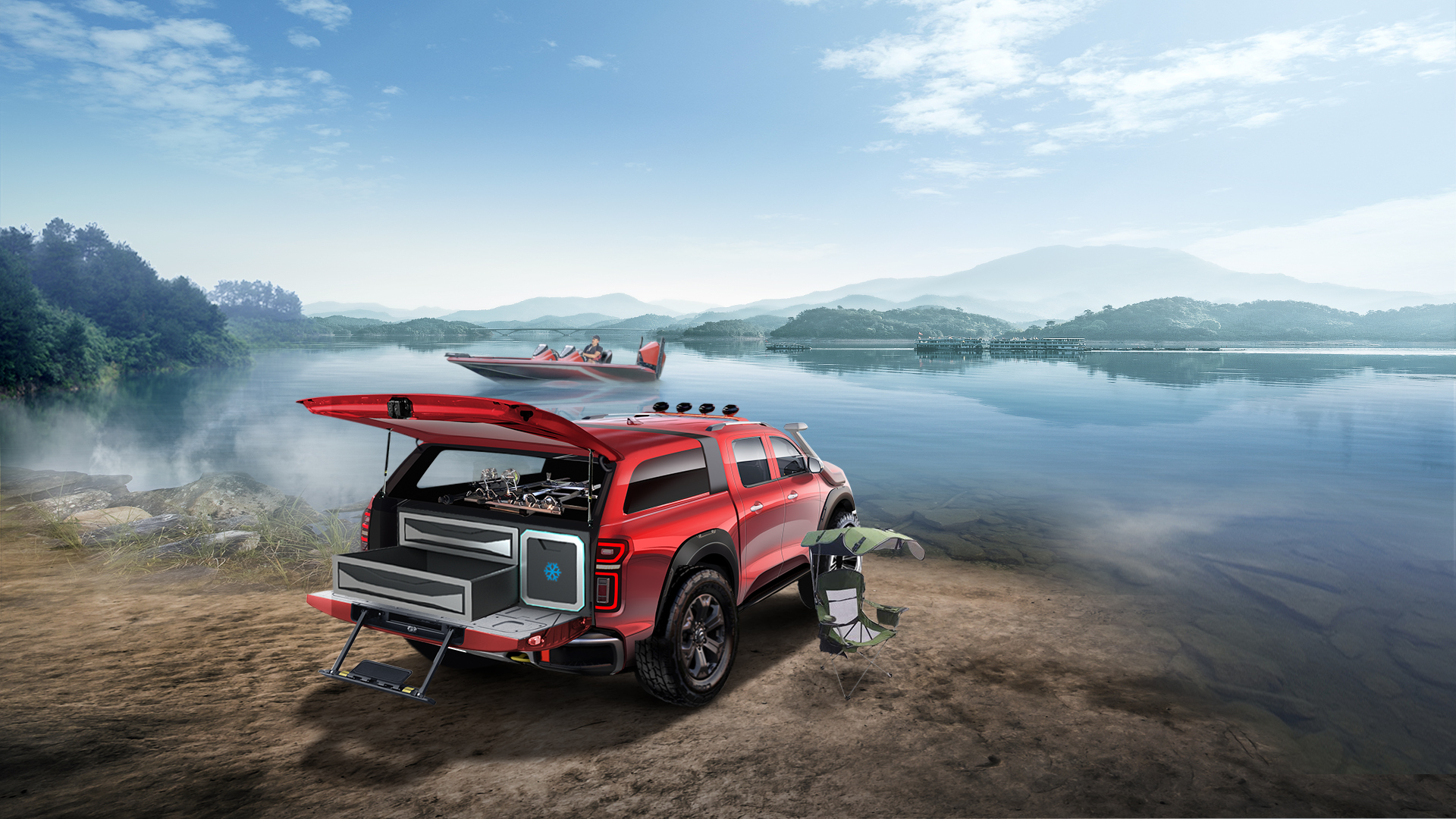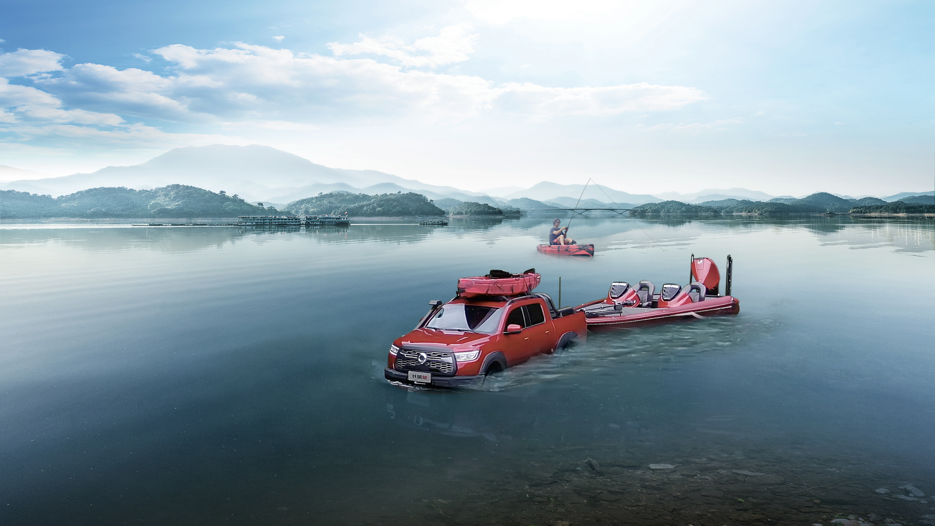 由于长城炮具备超强越野能力及拖船、涉水的产品特性,此次比赛中其将为路亚赛手带来极大的便利性,可谓完美契合路亚高端钓鱼运动的特殊需求。不仅可以拖拽路亚艇下水,甚至能在700mm深的水域自由行驶,可以代替路亚艇站在长城炮的货箱里钓鱼。