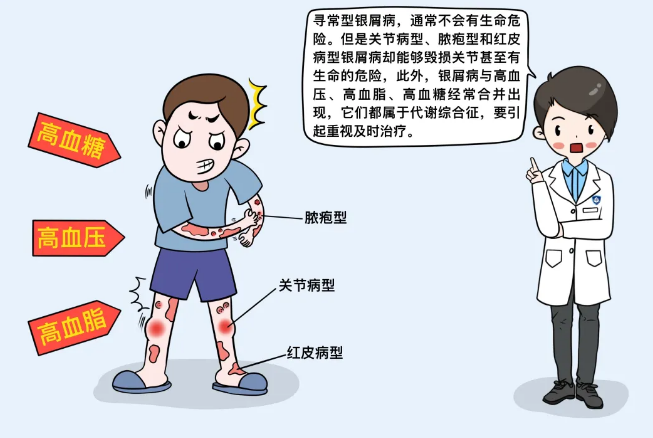 绝大多数患者属于寻常型银屑病,只要与它“和平共处”,通常不会有生命危险。但是,关节病型、脓疱型和红皮病型银屑病能够毁损关节,甚至会危及生命,应尽快就医治疗。银屑病与高血压、高血脂、高血糖常合并出现,要引起重视 并及时治疗。
