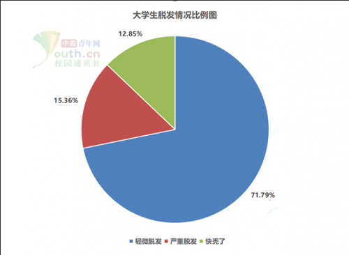 去年五月份,有一项问卷调查数据显示,超5成的大学生表示自己深陷脱发困扰,严重者因为脱发已影响到学习生活,超6成学生有采取措施缓解脱发,但收效甚微。另外,在调查脱发因素中,绝大多数大学生表示熬夜失眠、精神压力大、饮食不规律排在前三,而这三个因素几乎都是人为,大学生有充沛的精力熬夜,但不一定有毅力早起,加上大学自由时间比较多,三餐不规律是常态,长期恶性循环,会导致内分泌失调,影响身体调节机制和头发生长周期,最终造成脱发。