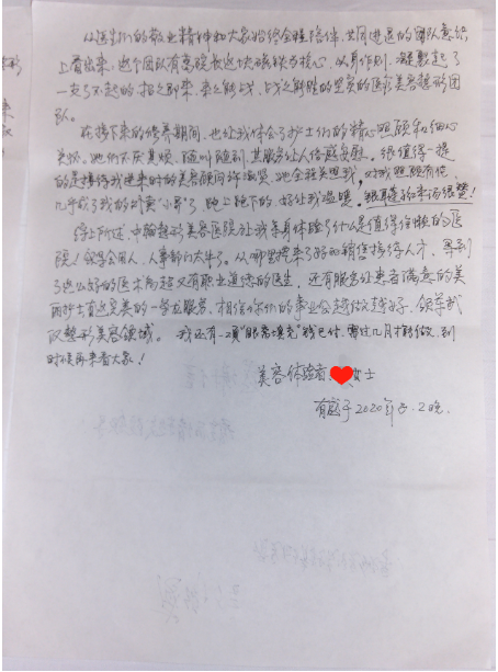 写在最后:武汉受疫情影响后解封以来,中翰都积极走在复苏武汉的前线,从全员核酸检测到全院定时定点消毒,设立专门来院扫码测量门禁,一丝不苟做好安全防护的同时为各路求美者提供最全面的服务。武汉的清零离不开所有人的努力和坚持,随着城市的复苏,人流量的恢复,求美者络绎不绝的上门,中翰人也是保质保量坚持为求美者带去好的服务质量。昨日,中翰收到一封特别的手写感谢信,字迹工整饱含感激之情深深感染了大家,也激励了中翰人坚守品质医美同时做更好的服务,也希望武汉中翰可以如感谢信中所说为武汉医美界做出榜样来!