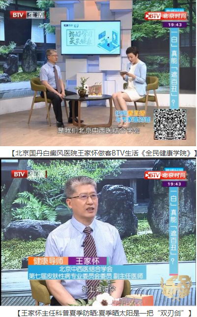 “一白”真的能“遮百丑”吗?皮肤变白都是白癜风吗?夏季白癜风易发展,晒太阳好不好?白癜风能不能治好,夏季怎样有效治疗?日前,北京中西医结合学会第七届皮肤性病专业委员会委员,北京国丹白癜风医院王家怀主任应邀做客BTV生活《全民健康学院》,向公众科普白癜风夏季防治知识,帮助广大白癜风患者“去伪存真”,科学认识和正确防治白癜风,积极传播健康正能量。受到广大白癜风患者和观众欢迎与好评。