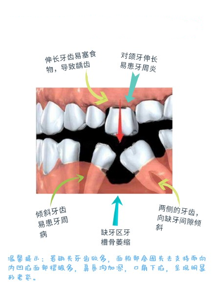 首先,牙齿脱落后长期不修复,会直接导致缺牙两侧的牙齿向缺牙方向移动,然后相邻的牙齿就会松动甚至脱落。换句话说,牙齿掉的越多,牙齿缝隙会越来越大、食物填塞、蛀牙等都是小问题。