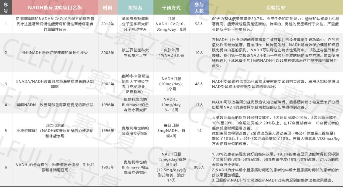 以上临床试验研究了NADH对运动表现,慢性疲劳,神经\认知退行性疾病如阿尔茨海默、帕金森,情绪病如抑郁症,倒时差,睡眠,皮肤炎症的作用。