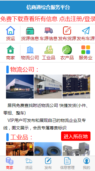 信商通的商家主力分为物流公司、工业品商家、农产品商家和服务业商家等几大类型。物流公司可以通过信商通平台发布和查找全国范围内的物流信息,精准地找到客户需要的具体路线以及具体车型容量等。不仅能够第一时间联系到始发地的各类货源,以便更好地配货,而且可以提早联系到达地的货源,从而可以统筹返安排程时的货运,做到有效利用货运时间和车辆空间,帮助公司节省不必要的物流开支,为公司带来更高的效益。更重要的是,物流公司可以利用信商通平台将公司的物流优势以及路线安排发布出来,以供本地乃至全国的客户及时了解,从而获得更多的运输机会,增加企业的业务量。