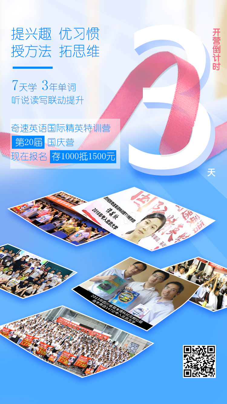 高中英语你不强,难度加大你够忙,英语拉分属正常,悔没把事儿来当,捶胸顿足两眼泪茫茫。以为高中英语新起点,高一追,高二赶,高三又傻眼,可惜一切都太晚。只能目送他人去重点。 孩子别急,家长别慌,“奇速英语7天短期单词阅读国庆营和冬令营”帮您忙!