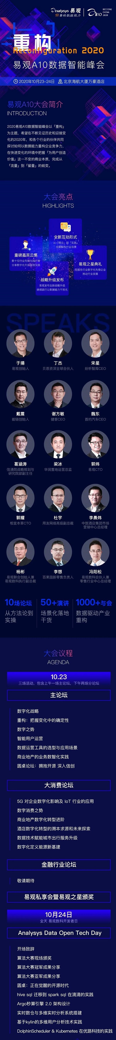 更多详细的session 及流程介绍,请参考下图。2020 年 10 月 23-24 日,易观 A10 数据智能峰会在北京召开,10月30日(上海站)、11月6日-7日(深圳站)也将开设分论坛,期待各位的参与。