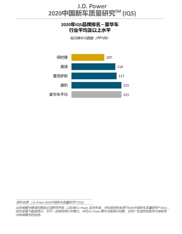 J.D. Power 2020中国新车质量研究(IQS)豪华车细分市场品牌排名
