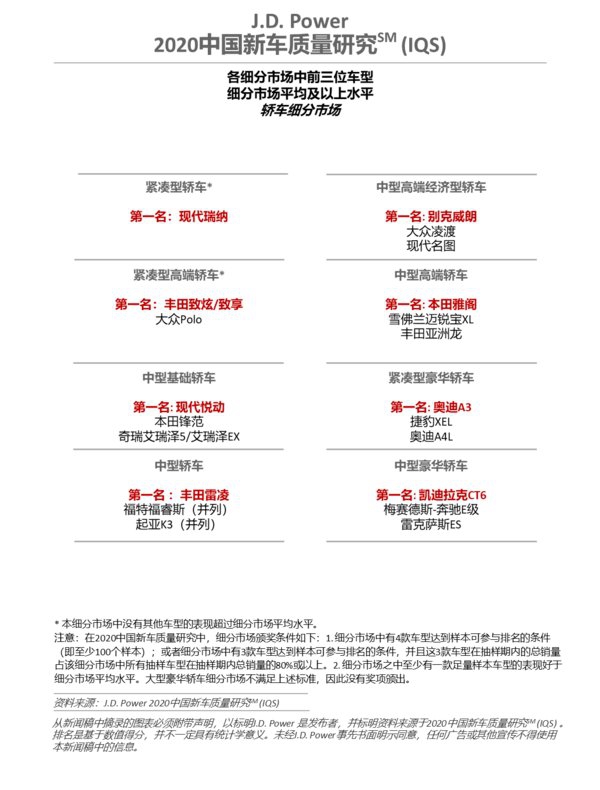 J.D. Power 2020中国新车质量研究(IQS)主流车细分市场品牌排名