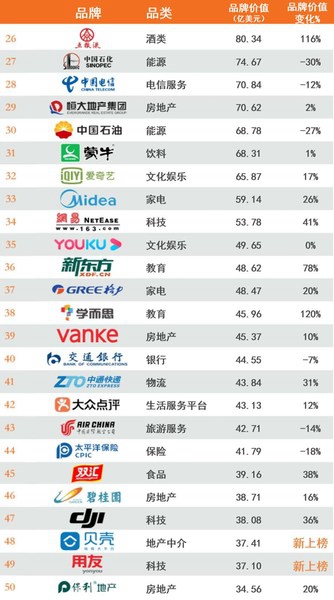 2020年最具价值中国品牌100强排行榜26-50