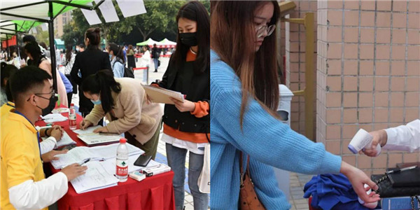 按照疫情防控的要求,在进入校园前,严格进行绿色健康码出示、测量体温、换口罩、消毒等环节。进入校园后需要上交健康承诺书、发放健康卡,整个过程都有各院系辅导员、教师、志愿者及保卫部门人员的指引和帮助。