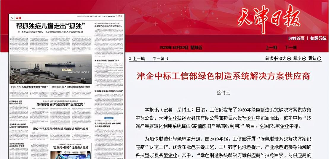 近日,天津日报发表文章《津企中标工信部绿色制造系统解决方案供应商》,报道天津企业拾起卖科技有限公司在数百家投标企业中脱颖而出,成功中标“终端产品资源化利用系统集成(高值废旧产品回收利用)”项目。全国仅3家企业中标。
