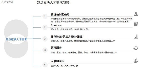 同时,针对热点板块人才需求的趋势,段立新重点从传统仿制药公司、体外诊断/第三方检验/器械、医疗服务、互联网医疗等领域切入,引起关注的是,医药大健康人才缺口较大。随着产业创新发展,技术加速进步,对人才质量要求越来越高,研发类人才、高精尖人才、复合型人才将成为大健康行业的“香饽饽”,竞争状态将趋于白热化。