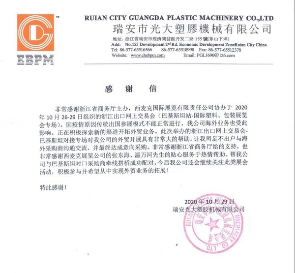 10月20日至30日,为期两周的浙江出口网上交易会(巴基斯坦站-塑料、包装专场)以在线视频对接的形式成功举办,在主办方有效组织和精准邀约的前提下,中巴双方企业参与热情高涨,供需双方都收获满满。