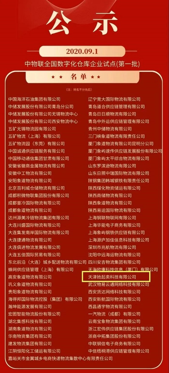 为积极响应《国务院办公厅关于积极推进供应链创新与应用的指导意见》(国办发〔2017〕84号),贯彻执行《商务部等八部门关于开展供应链创新与应用试点的通知》(商建函〔2018〕142号),落实“中物联全国数字化仓库企业试点”推广工作的内容。由企业自主申报及地方物流行业协会推荐,经中物联全国数字化仓库试点推广领导小组秘书处专家委员会评审通过,全国认定71家单位为“中物联全国数字化仓库企业试点(第一批)”。天津市天津拾起卖科技有限公司等荣获试点。