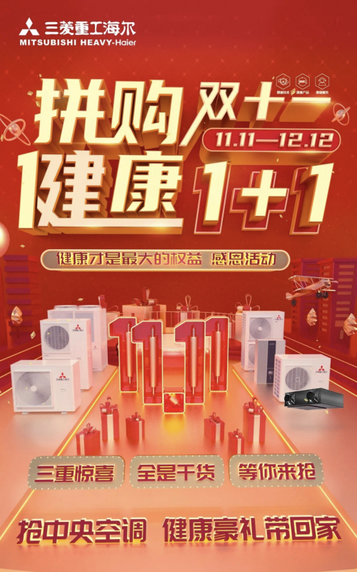三菱重工海尔双十一狂欢购物节即将火爆启动,11月11日零点开始,工厂保价抢空调,所有参与活动的产品均以最优惠价格面向客户,拒绝套路,买空调送礼品,买空调送健康,向定金尾款say no!