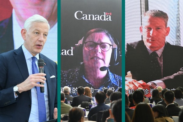 加方代表致辞 左起:加拿大驻华大使鲍达民先生;加拿大自然资源部助理副部长(林业)Beth MacNeil女士;加拿大木业董事会主席Bart Bender先生