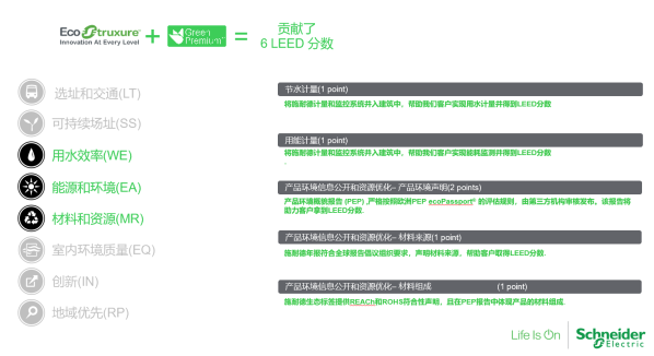 施耐德电气Green Premium 生态标签的价值主张则能帮助那些期望取得LEED认证的企业在用水效率(WE)、能源和环境(EA)、材料和资源(MR)三大维度上获得6 个关键的LEED 分数。具体来说,利用数字化手段,施耐德电气的计量与监测系统可帮助建筑运营者可视化并分析用水与用能的指标,还能提供建筑内所应用绿色电气产品的,包括产品材料来源、材料组成的环境概貌报告 (PEP)。