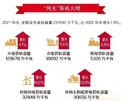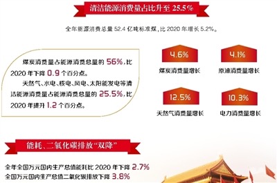 国家统计局2月28日发布的《2021年国民经济和社会发展统计公报》显示,2021年我国能源消费结构持续优化,清洁能源消费量占比升至25.5%,较2017年大幅提高5个百分点,全年全国万元国内生产总值能耗和二氧化碳排放实现“双降”,标志着“十四五”开局之年能源产业绿色低碳转型成效显著。
