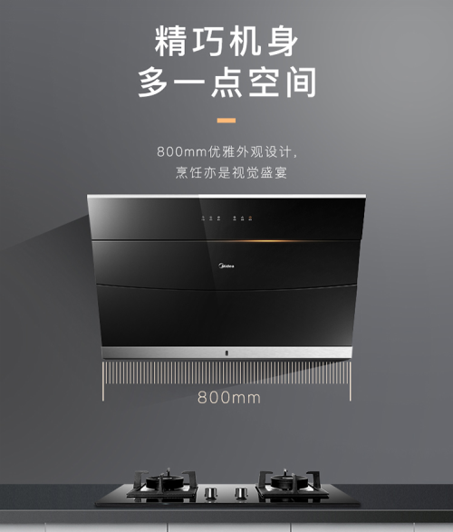美的J57油烟机外观全部采用黑晶钢化玻璃面板,加上高灵敏度的触控面板和灵动的透光按键,彰显时尚品味,百搭各种家居场景,无需担忧与家装风格有冲突之处。同时易于擦拭,烹饪完毕后顺手用抹布轻轻一抹,细腻不留水渍。值得一提的是,美的J57油烟机宽度达到了800mm,大大的提高了拢烟范围,控烟区更大,进一步提高吸烟排烟的速度,让油烟无处可逃。