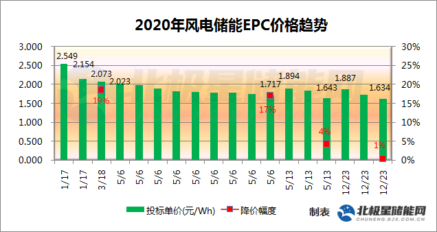 据北极星储能网统计,2020年截至目前共有五个风电储能项目公示中标价格,风电单价从1月份的最高2.549元/Wh、降至了目前最低1.634元/Wh,一年内降幅达35.9%。