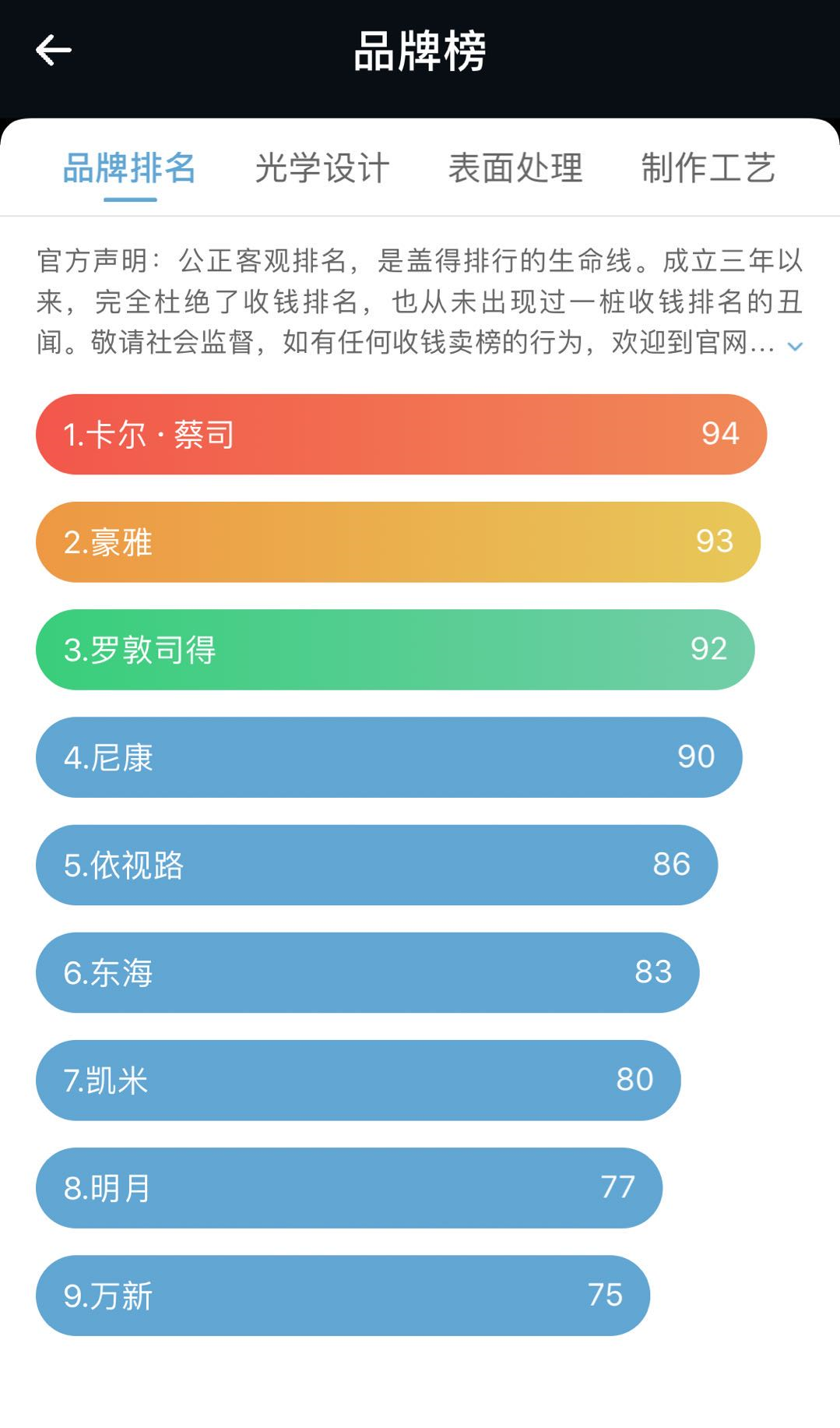 下面是镜片的排行榜,大家可以参考一下,能选好一点的镜片,就选好一点的镜片吧。