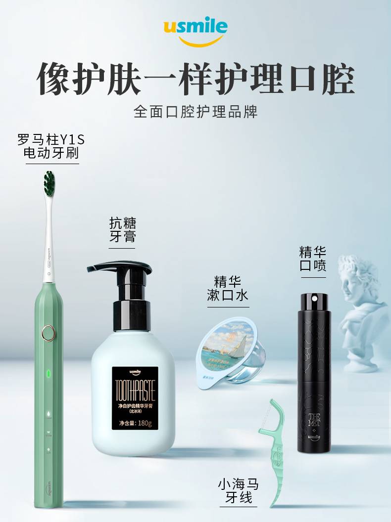 usmile从来没有把目光局限在电动牙刷这一单一品类上,从品牌创立伊始,就已经在布局口腔护理全线产品,直至今日,usmile与国内外权威口腔专家合作,制定了一套完整且系统的全面口腔护理4大步骤,基于此,衍生出了对应的全面口腔护理产品。