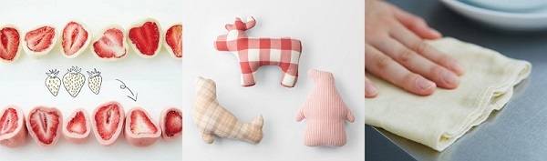 在MUJI商品中,有利用纺织工序中废弃的短纤维棉及落棉制作而成的落棉抹布;使用未经分选的不规则草莓制作的巧克力冻干草莓;活用剩余的床品面料制作而成的动物靠垫等。为实现地球资源的循环以及废弃物的减排,MUJI还对袜子挂钩、披肩挂放挂钩以及内衣的塑料包装等进行了重新审视,除去塑料包装或改用再生纸等材料。