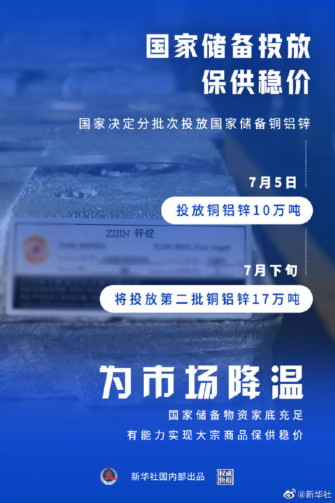为大宗商品保供稳价,国家发展改革委、国家粮食和物资储备局决定分批次投放国家储备铜铝锌。继7月5日投放国家储备铜2万吨、铝5万吨、锌3万吨后,7月下旬将投放第二批国家储备铜3万吨、铝9万吨、锌5万吨。国家粮食和物资储备局物资储备司司长徐高鹏表示,国家储备物资家底充足,有信心、有能力稳定预期,为市场降温。