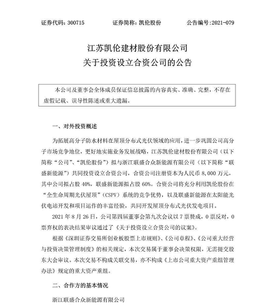 近日,联盛新能源与凯伦股份达成合作协议,共同投资设立合资公司,其中联盛新能源拟占股60%,凯伦股份拟占股40%。合资公司将充分利用联盛新能源在分布式光伏电站开发和项目运作的丰富经验,以及凯伦股份在“全生命周期光伏屋顶”(CSPV)系统的竞争优势,共同开发屋顶分布式光伏发电项目。