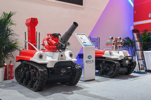 此次参展的灭火侦察机器人和侦察机器人,是迪马工业自主生产研发的新一代消防机器人,其中灭火侦察机器人主要以灭火为主,侦查机器人主要以侦查为主,适用于各种大型危险化学品、大跨度商业建筑、工厂、商贸企业、矿山、隧道、地铁、仓库、飞机库、船舶等灾害隐患多发地,替代消防员在危化火场或浓烟火灾现场进行灭火救援,采集危险物质样本,进行理化性质分析,并将信息传输至功能侦检消防车及现场指挥部指挥终端,为指挥员提供指挥决策依据。