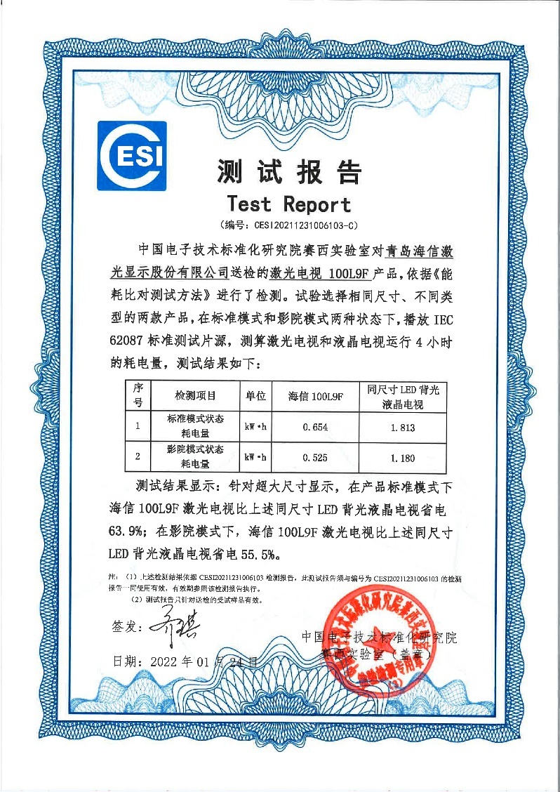 日前,中国电子技术标准化研究院赛西实验室公布了100英寸激光电视和同尺寸液晶电视的能耗对比测试结果:选取市场主流的100英寸激光电视和同尺寸液晶电视进行能耗对比测试,在相同条件下测算激光电视和液晶电视运行4小时的耗电量,在产品标准模式下,激光电视比液晶电视省电63.9%;在影院模式下,激光电视比液晶电视省电55.5%。