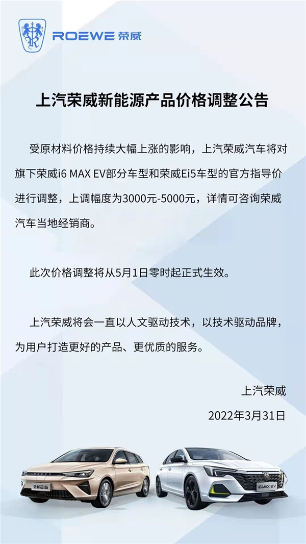 3月31日,荣威品牌官方宣布:受原材料价格持续大幅上涨的影响,上汽荣威汽车将于5月1日零时起,对旗下荣威i6 MAX EV部分车型和荣威Ei5车型的官方指导价进行调整,价格上调3000-5000元。