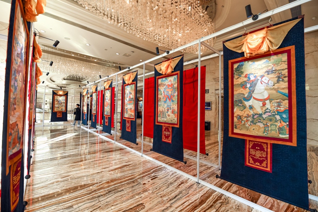 推介会现场展出了100幅珍稀的“三国文化”唐卡,这百幅唐卡采用噶玛嘎孜画派的传统画法,使用千年不朽的藏纸和自然丰富的矿物质原料,以艳丽的色彩和细腻的笔触,展现了一个人们心目中的三国时代。举办此次“三国文化”唐卡展,也是希望能进一步推动藏族与汉族之间的文化交流和融合,促使各民族像石榴籽一样紧紧抱在一起,铸牢中华民族共同体意识。