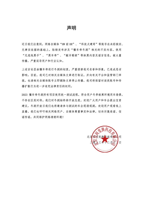 声明中指出,近日懂车帝注意到网络自媒体“HW前HR”、“科技犬建哥”等账号在未经核实、无事实依据的基础上,陆续发布涉及“懂车帝冬测”相关的不实内容,使用“无底线黑手”、“黑车帝”、“敲诈勒索”等抹黑内容及谣言信息,被大量传播,严重误导用户和行业认知。