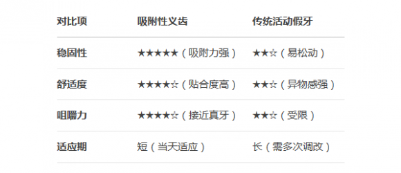 1.稳固性强:利用口腔黏膜和唾液的自然吸附力,大幅减少假牙松动、移位的问题,吃饭、说话更安心。