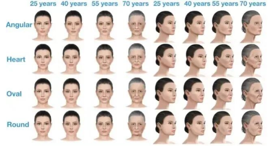 从外貌分析,一张年轻的脸轮廓呈倒三角形,衰老的脸呈正三角形。这一变化不仅会让脸型发生变化,还会让脸看上去更大、更宽。