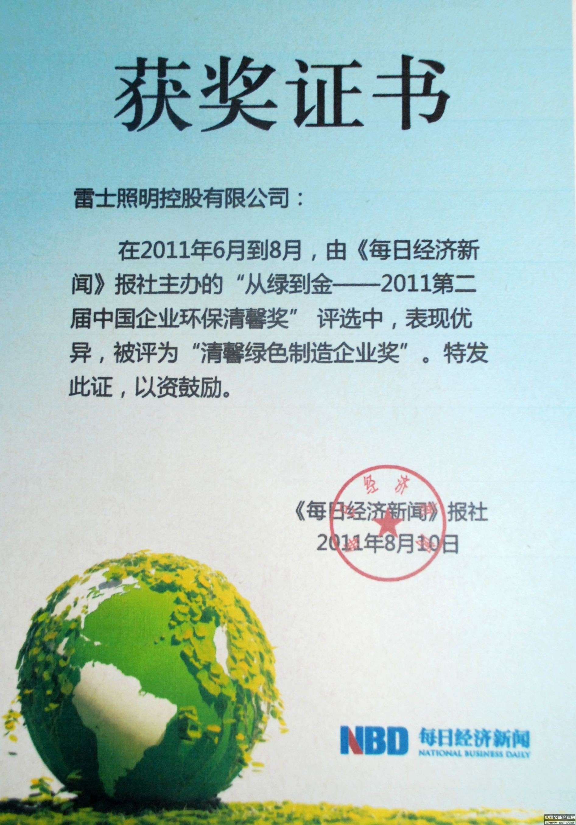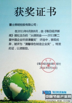 雷士照明荣获第二届中国企业环保清馨奖