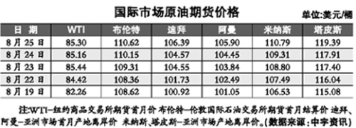 8月25日纽约商品交易所(WTI)的10月轻质原油期货收盘价比上个交易日(24日)跌0.28美元/桶,以85.16美元/桶报收。伦敦ICE交易所10月布伦特原油期货合约结算价报每桶110.15美元/桶,涨0.84美元/桶。本周(8月18—25日)WTI10月轻质原油期货均价83.89美元,较上周跌3.07美元或3.53%;布伦特10月原油期货均价108.69美元,较上周小涨0.81美元或0.74%。