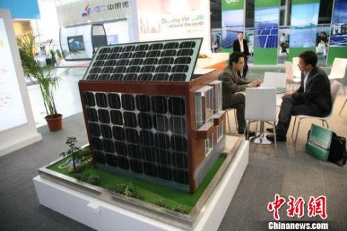 一家光伏企业在中国(南京)第六届国际新能源展览会上展示住户用太阳能发电的模型。